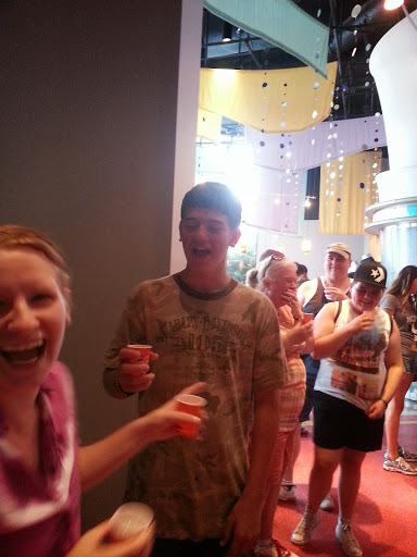 To start the day, while everyone rode Spaceship Earth, I ran on to get us fastpasses for Soarin’ because they were already almost gone! We met back up to ride Imagination with Figment, which Amelia absolutely loved – she even got a little stuffed Figment doll. After playing around in the Innovations pavilion, we took everyone to Club Cool to try “Beverly”… there were some pretty funny faces. We got everybody with it! Alex and Aidan tried it even after watching Rachel and Dustin’s reactions to it. Everyone got a kick out of it.