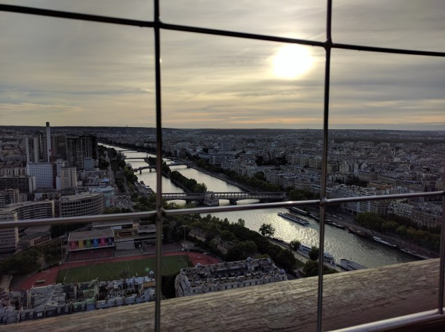 To get to the top level, you first ride the elevator to the second floor. On the way up, you skip the first floor and head about 300 feet up to the second floor. The elevator had glass walls so you could clearly see how high up you were going, which was enough to make my stomach queasy. On this level, there were gift shops, snack and drink options, and restrooms. The view from here was spectacular, especially the sun setting over the Seine River.